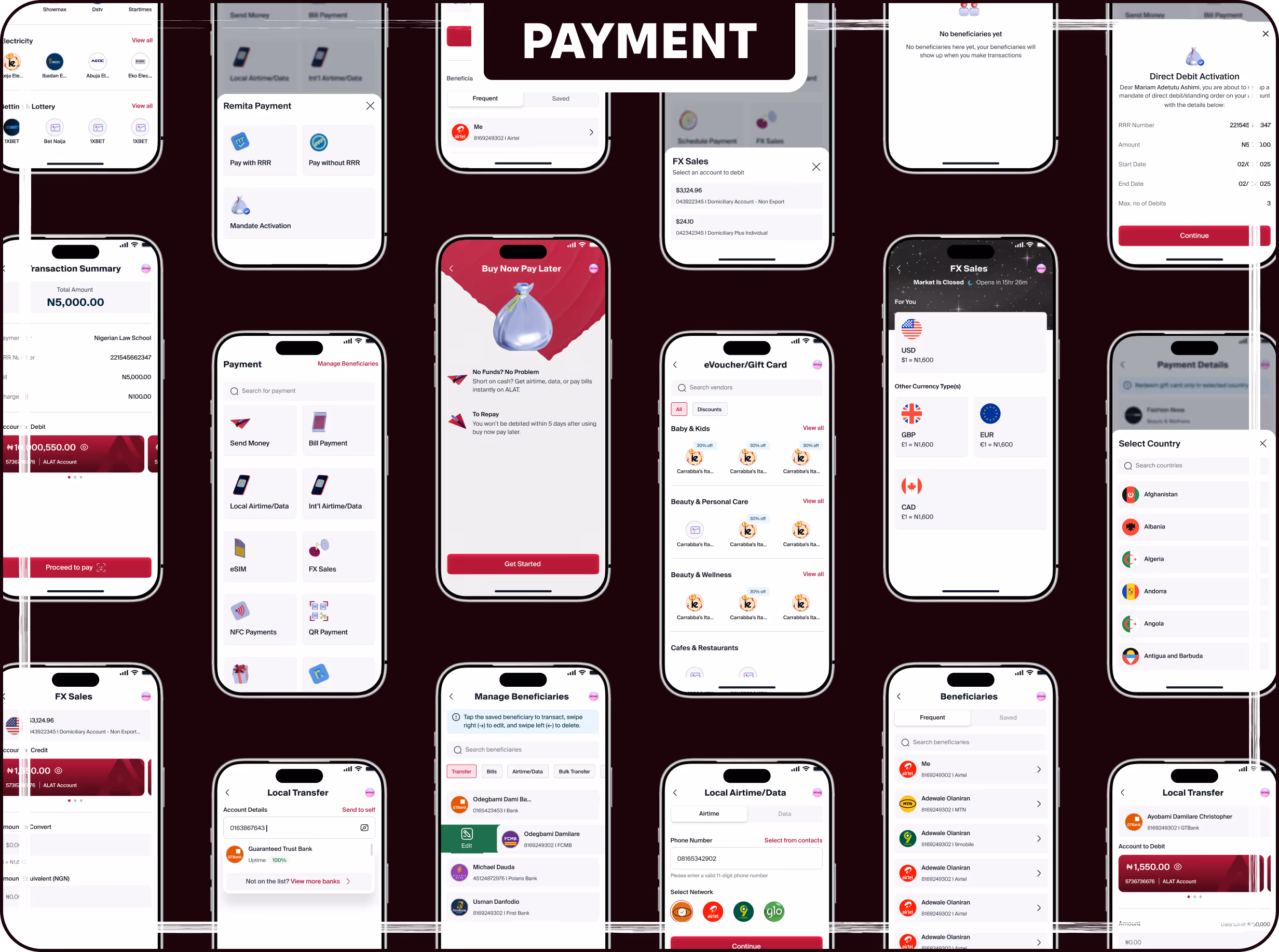 Transfer (Send Money), Airtime/Data, FX Sales, eVoucher, Bills, BNPL, Remita, Scheduled Payments, Network Uptime, Contactless Payment