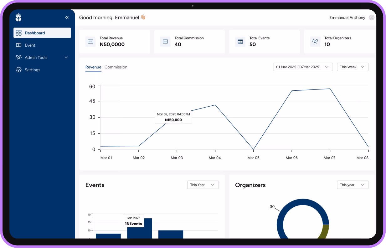 Edit event, create discount codes, check-in guests.
